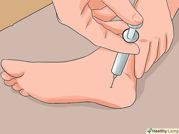 Спробуйте зробити ін'єкцію кортикостероїдного гормону.Ін'єкція стероїдного препарату, зроблена поблизу запалених сухожиль і м'язів або прямо в них швидко знизить запалення і біль, проте цей спосіб застосовується зазвичай спортсменами, яким необхідно швидке і короткочасне полегшення для того, щоб продовжити участь в змаганнях.[15] найбільш часто використовуються такі препарати, як преднізолон, дексаметазон і триамцинолон.- Ін'єкції кортикостероїдів можуть призвести до таких ускладнень, як інфекція, кровотеча, ослаблення сухожиль, локальна м'язова атрофія і роздратування або пошкодження нервових волокон.
