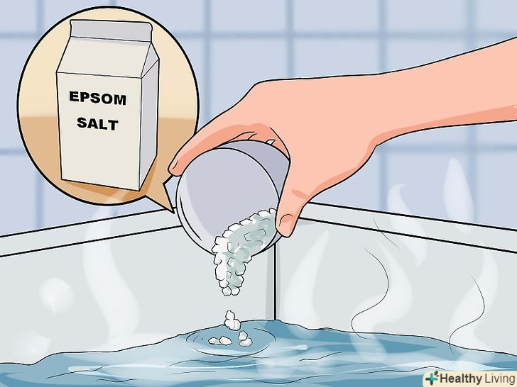 Приймайте ванни з сіллю Епсома.тепла вода з сіллю Епсома може значно зменшити біль і опухлість ніг, особливо в тому випадку, якщо біль викликаний напругою м'язів.[8] міститься в солі магній сприяє розслабленню м'язів. Не напускайте в ванну занадто гарячу воду, щоб уникнути опіків і не проводите в ній більше 30 хвилин, оскільки в солоній воді організм втрачає рідину, в результаті чого може наступити зневоднення.- Якщо ви страждаєте від опухання ніг, після теплої соляної ванни потримайте ступні в прохолодній воді до тих пір, поки не відчуєте легке оніміння (близько 15).
