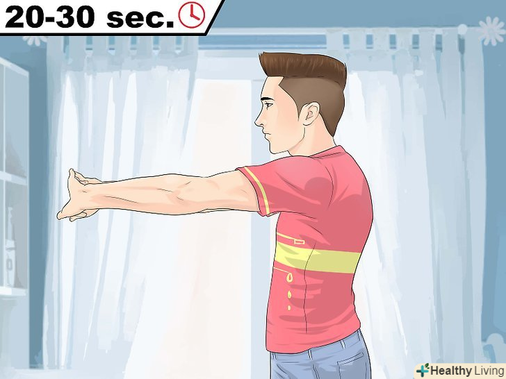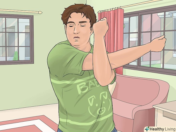 Розтягніть плече іншою рукою.ця вправа допоможе розтягнути м'язи і знизити напругу в плечах.[17]- Витягніть ліву руку поперек грудей. Постарайтеся протягнути її якнайдалі вправо.[18]