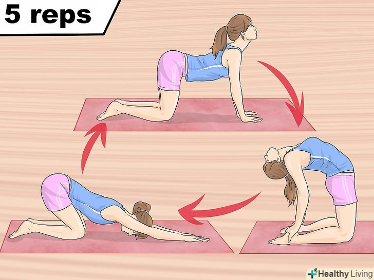 Виконайте деякі вправи, що практикуються в пілатесі.рухи з цієї гімнастики допоможуть вам провести розтяжку м'язів спини, напруга яких призводить до утворення вузлів. Для розслаблення цієї групи м'язів особливо хороша послідовна комбінація поз молиться, потягується кота і верблюда.[20]- Встаньте на карачки. Зробіть глибокий вдих, переносячи центр ваги на п'яти. Витягніть руки перед собою, опустивши голову до підлоги. Це поза молиться. Ви відчуєте, як розтягуються м'язи попереку.