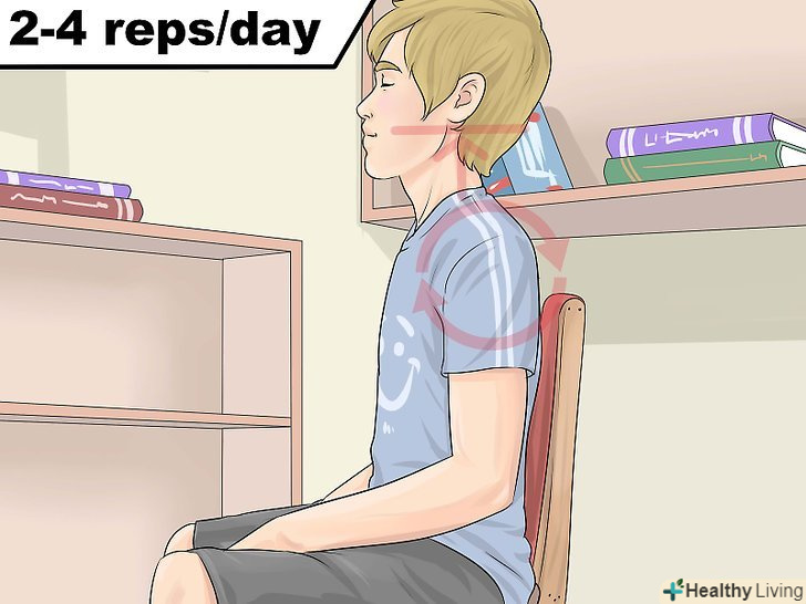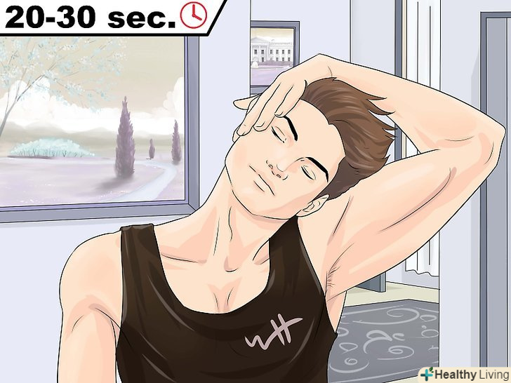 Зробіть розтяжку шиї.притисніть вухо до відповідного плеча, легко притримуючи голову тією ж рукою. Ви повинні відчути легку розтяжку м'язів, але не біль. Протримаєтеся в такій позі 30 секунд, після чого розслабтеся. Повторіть те ж з іншого боку.[21]- Притисніть підборіддя до грудної клітки. Проробляйте це протягом 20-30 секунд.