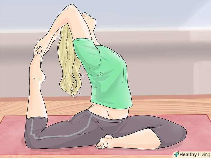 - поза трикутника посилить вашу спину і ноги і розтягне бічні м'язи корпусу і стегон. Встаньте на килимок для занять йогою, розвівши ноги в сторони приблизно на 1,2 метра. Розгорніть праву ступню назовні так, щоб вона розташовувалася паралельно довгому краю килимка. Ваші п'яти при цьому повинні утворювати пряму лінію. Витягніть руки в сторони, щоб вони утворювали з вашим тілом букву "Т". Нагніться вправо, витягнувши праву руку до правої ступні. Залишайтеся в такій позиції до тих пір, поки не відчуєте дискомфорт. Повторіть вправу, схилившись вліво.[30]