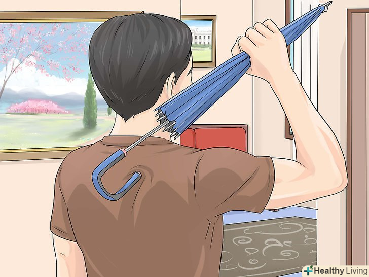 Візьміть що-небудь, що дозволяє дотягнутися до важкодоступних ділянок спини.скористайтеся парасолькою з закругленою ручкою або спеціальним масажером "Body Back Buddy" з вигнутим гачком.- Якщо вузол виник на плечі, просто помістіть на нього ручку парасольки або масажера, після чого натисніть на вузол. Як і у випадку з тенісним м'ячиком, масажуйте вузол до тих пір, поки він не розсмокчеться.