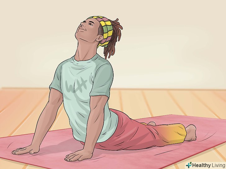Займіться йогою.при виборі вправ, що сприяють зміцненню спини, обов'язково зверніть увагу на йогу. Вона допоможе послабити біль, а також посилить м'язи спини і підвищить вашу гнучкість. Ось кілька поз, які варто спробувати:[26]- Поза собаки мордою вниз зміцнить поперек. Вона націлена на м'язи-розгиначі, що допомагають вам стояти і піднімати предмети. Встаньте на карачки. При цьому простежте, щоб ваші коліна були розташовані прямо під стегнами, а руки трохи попереду плечей. При видиху відірвіть коліна від підлоги і підніміть їх, випрямивши ноги. Витягніть п'яти у напрямку до підлоги. Випряміть ноги, не торкаючись колінами один одного. В результаті ваше тіло утворює подобу арки.[27]