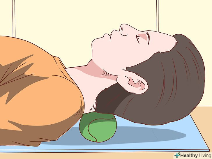 Використовуйте додаткові пристосування.хоча багато хто відчуває полегшення, просто масажуючи пальцями вузли скупчення стресу, важливо випробувати і інші різні масажні техніки, щоб знайти ту, яка підійде саме вам. Багато людей вважають корисним використання тенісного м'яча.[3]- Щоб використовувати техніку тенісного м'яча, ляжте на підлогу і покладіть тенісний м'яч під шию, приблизно на те місце, де знаходяться вузли. Можна також зробити це, притулившись до стіни.