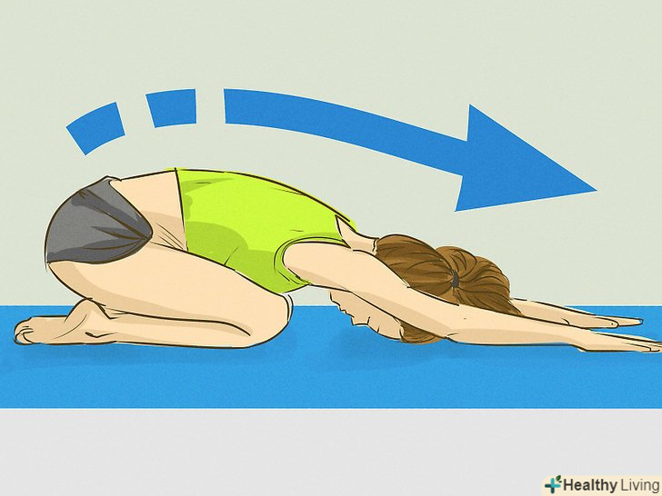 Спробуйте акуратно розтягувати м'язи верхньої частини спини.розтяжка проблемної ділянки спини здатна полегшити стан, особливо в тому випадку, коли ви намагаєтеся впоратися з проблемою на ранній стадії. Виконуйте повільні розмірені руху і глибоко дихайте під час розтяжки. В цілому, затримуйтеся в позі розтягування приблизно на 30 секунд і повторюйте розтяжку по три-п'ять разів щодня- Станьте на коліна на підстилку, опустіть сідниці собі на стопи. Нахиліться вперед, зігнувшись в талії, і по підлозі потягніться руками так далеко вперед, як тільки зможете, намагаючись при цьому носом торкнутися підлоги.