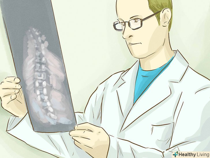 Розпитайте лікаря про сколіоз.сколіоз-це викривлення хребта в бічному напрямку, яке зазвичай з'являється у підлітків до статевої зрілості.[10] сколіоз може призводити до болів у верхній і середній частинах спини. Легкі форми сколіозу не завжди помітні оку, але навіть вони здатні викликати біль і поступово посилюватися з плином часу, приводячи до більш серйозних ускладнень, включаючи пошкодження серця і легенів і зовнішнє зміна форми тіла, наприклад, нерівними можуть стати плечі, стегна і грудна клітка.[11]- Для перевірки на сколіоз лікар попросить вас нахилитися вперед і подивиться, чи не стирчать будь-які з ребер з одного боку більше, ніж з іншого.[12] також лікар може перевірити вас на м'язову слабкість, нечутливість і неправильні рефлекси.[13]