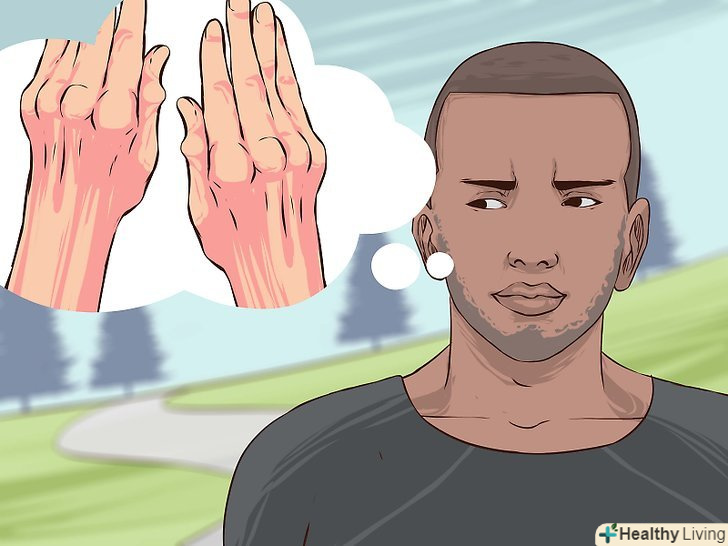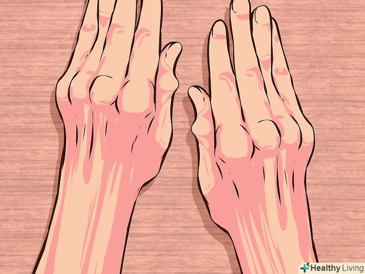 Поспостерігайте за симптомами ревматоїдного артриту.першими ознаками зазвичай є набряки суглобів, біль в них, потепління шкіри в цих місцях. Багато людей з ревматоїдним артритом відчувають помірний біль і нерухомість суглобів, але під час загострень симптоми посилюються. У інших людей постійно спостерігаються симптоми цього захворювання. У міру розвитку хвороби можуть пошкодитися суглоби і кістки, що призводить до втрати працездатності цих органів, проте раннє лікування дозволяє попередити подібні симптоми.[25] до симптомів також відносяться:- Втома, м'язовий біль, тугорухливість суглобів, яка спостерігається протягом години після сну вранці або після довгого періоду відсутності руху (на відміну від болю і нерухомості при остеоартриті, які проходять швидше).[26]