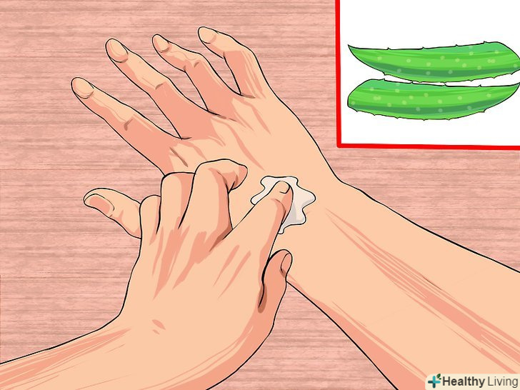 Нанесіть гель Алое вера на суглоби.спочатку перевірте, чи не викличе гель алергічну реакцію, на невеликій ділянці шкіри. Якщо з'явиться висип або інші симптоми, не користуйтеся гелем. Якщо роздратування не буде, нанесіть гель на ділянки, які завдають вам основний біль. Наносите як звичайний крем. Це дозволить тимчасово послабити біль. Якщо на шкірі не буде висипу, ви зможете користуватися гелем стільки, скільки захочете.- У більшості людей не виникає побічних ефектів, однак алое вера може викликати почервоніння, печіння або поколювання. Іноді Можлива висип, яка швидко проходить.[6]