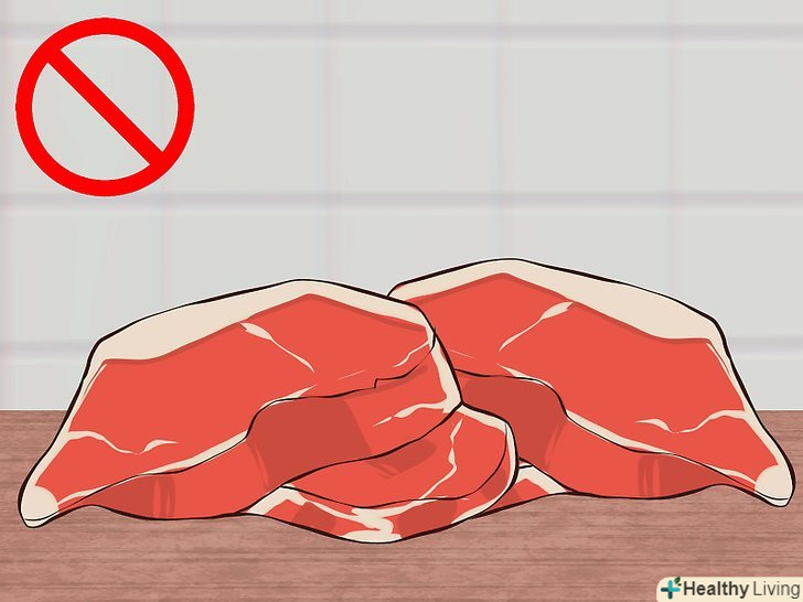 Обмежте кількість споживаного м'яса.якщо ви їсте м'ясо, купуйте нежирну яловичину (бажано м'ясо корів, які харчувалися травою, оскільки в ній буде багато омега-3 і 6 жирних кислот) і птицю (її слід їсти без шкіри). У всьому м'ясі не повинно бути антибіотиків і гормонів, а жир слід зрізати. Обмежте споживання м'яса, що дозволить вам знизити кількість насичених жирів, що надходять в організм. На насичені жири має припадати не більше 7% денного калоражу.[16]- Щоб скоротити кількість насичених жирів, відмовтеся від вершкового масла, маргарину і кулінарного жиру. Краще готувати на оливковій або рапсовому (каноловому) маслі.