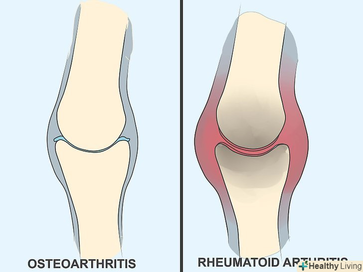 Зверніть увагу на набряк і почервоніння суглобів.хоча термін" артрит " буквально означає запалення суглоба, при деяких формах захворювання опухлість набагато сильніше, ніж при інших. Як правило, зношування суглобових тканин при ОА не призводить до значного набряку і почервоніння. І навпаки, РА характеризується сильним набряком і почервонінням з огляду на те, що імунна система організму атакує внутрішній шар суглобової сумки, синовіальну оболонку.[3] Подагра також супроводжується сильним запаленням через відкладення в суглобовій сумці гострих кристалів сечової кислоти, особливо у великих пальцях ніг.- При ПсА імунна система також атакує суглоби, тому дана форма класифікується як аутоімунне захворювання. Цей різновид артриту також супроводжується помітними набряками і почервонінням.