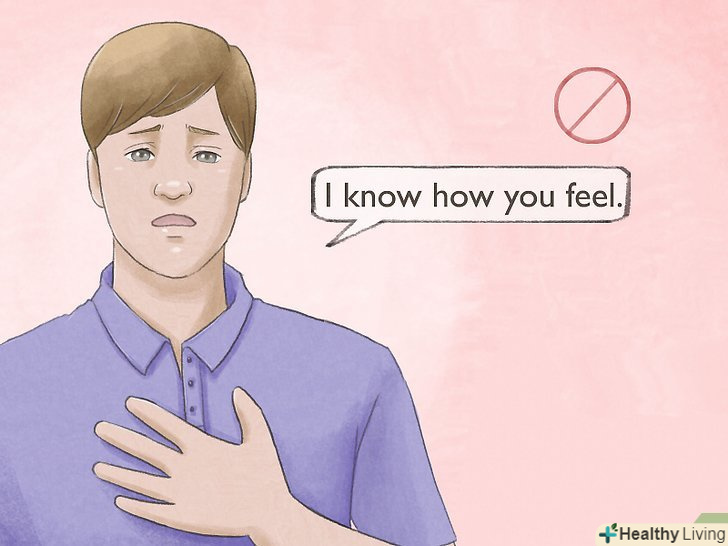 - "я знаю, що ти відчуваєш".[5] іноді люди говорять ці слова тим, хто переживає важкі часи, і хоча вони можуть виявитися правдою, неможливо точно знати, що відчуває інша людина. Дана фраза звучить ще гірше, якщо її вимовляє хтось, кому не довелося випробувати того, з чим зіткнувся його співрозмовник. Наприклад, якщо хтось втратив кінцівку, не варто порівнювати його положення з ситуацією, коли ви зламали руку. Це зовсім різні речі. Проте, якщо ви стикалися з подібними проблемами, можна поговорити про них і сказати "я пройшов через щось подібне".