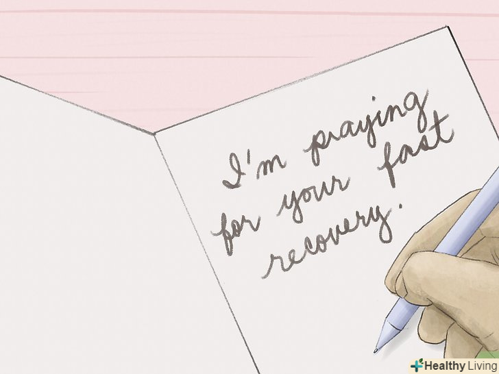 Надішліть листівку або зателефонуйте.якщо ви не можете відвідати друга, пошліть листівку або зателефонуйте йому. Звичайно, легше послати текстове повідомлення або написати в соціальних мережах, але краще відправити звичайну листівку або зателефонувати — так ви проявите більше уваги і турботи, і людина обов'язково оцінить це.- Подумайте про те, щоб написати повне турботи лист. Цей варіант особливо хороший в тому випадку, якщо ви ставитеся до тих людей, які губляться і не знають, про що говорити з оточуючими, коли ті знаходяться в складній ситуації. Можна написати лист, а через деякий час перечитати його і внести правки, якщо ви вважаєте, що воно недостатньо повно висловлює ваші почуття. При цьому зосередьтеся на добрих побажаннях, молитвах про одужання і хороших новинах, які не відносяться до хвороби.