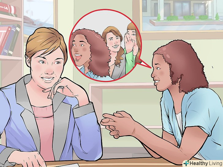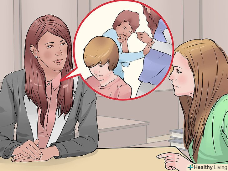Зверніться до старшого.після перетину певної риси Ви повинні розповісти про цькування комусь із старших. Якщо задирака продовжує мучити вас, незважаючи на всі спроби ігнорувати або протистояти, то ви повинні повідомити про це. Не дивіться на це як на ябедництво. Якщо хтось переводить вас, то він може переводити і інших учнів. При цьому створюються ненормальні умови, які небезпечні для всіх. Дуже важливо припиняти знущання.[6]- Батько, вчитель, класний керівник, директор або інша авторитетна особа повинні втрутитися в ситуацію. Зверніться до дорослого, якому ви довіряєте, який зможе вірно оцінити ситуацію. Якщо ви знаєте тих, хто бачив агресивну поведінку або став його жертвою, то попросіть цих людей прийти на розмову разом з вами.