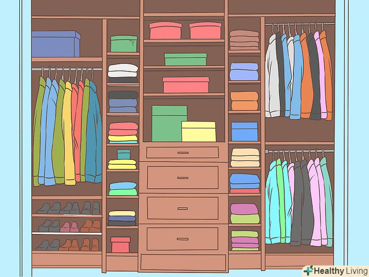 Наведіть порядок у шафі.перегляньте свій гардероб і викиньте речі, які більше не підходять за розміром або які ви давно вже не носите. Розсортуйте весь одяг, взуття, аксесуари, куртки і пальто і відправте все те, що ще можна носити, в місцеву благодійну організацію. Викиньте зношені або зіпсовані речі, здайте на переробку або придумайте для них нове використання (зробіть з них килимки або перетворите в Матеріали для виробів).[6]