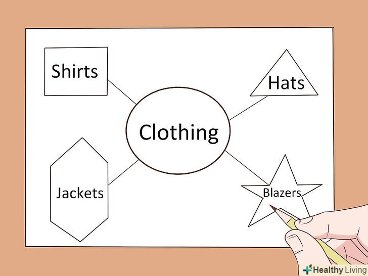 Складайте схеми зв'язків.[15] схеми зв'язків-це можливість досліджувати власні ідеї без обмежень за допомогою візуальної і логічної організації, спосіб задіяти весь мозок і стимулювати творчість.- Візьміть аркуш паперу і ручку. У центрі листа напишіть поняття (наприклад, «одяг»), з яким ви працюєте, а потім обведіть його в гурток або квадрат.