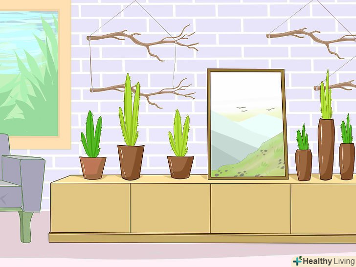 Прикрасьте будинок рослинами і природними декоративними елементами.Кімнатні квіти і вироби з дерева допоможуть вам розслабитися. Уявіть, що ви приносите в свій будинок безтурботність природи. Наприклад, можна заповнити низьку вазу гілками і шишками і поставити на журнальний столик.[6]- Щоб урізноманітнити інтер'єр, придбайте для кімнати практичні прикраси, наприклад, хутряні покривала.