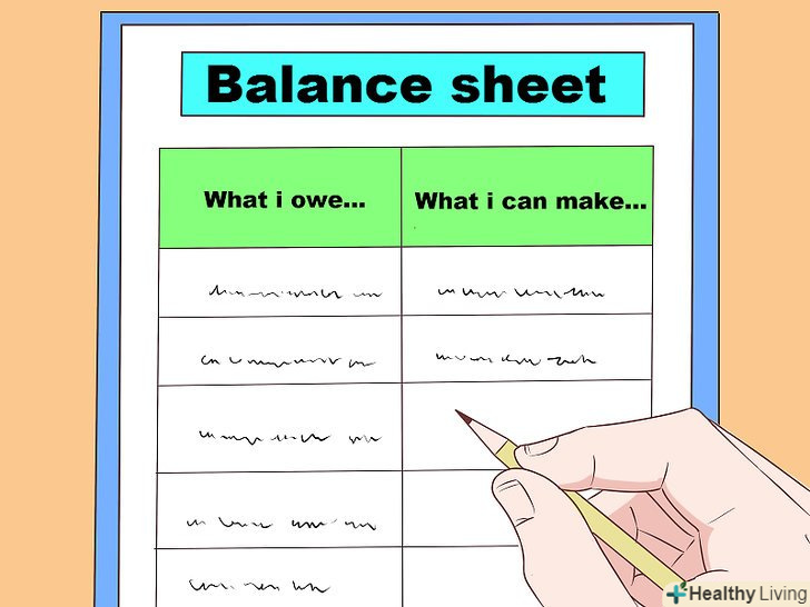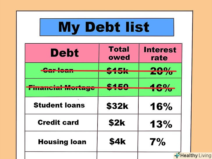 Розберіться зі своїми боргами.складіть повний підрахунок того, що ви повинні і як давно. Приділіть особливу увагу процентним ставкам за боргами. Сплачуйте найвищу процентну заборгованість якомога швидше, сплачуючи принаймні мінімальні щомісячні платежі за іншими боргами. Це дозволить запобігти збільшенню процентних ставок.- Як тільки Ви погасите саму високопроцентну заборгованість, переходите до наступної найвищої.