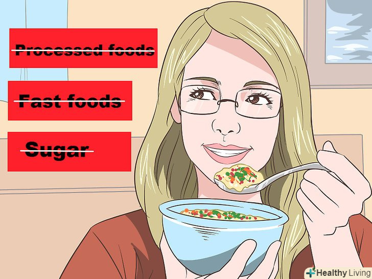 Змініть свій раціон.придивіться до того, що ви їсте і в яких кількостях. Відмовтеся від оброблених продуктів і їжте більше натуральних альтернатив. Будьте впевнені, що ваші страви збалансовані і що ви їсте у відповідний час дня.- Уникайте надлишку цукру, особливо обробленого цукру. Приплив енергії недовговічний, а оброблені цукру швидко і легко перетворюються в жири.