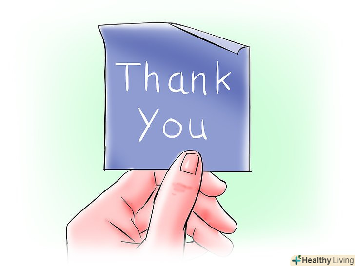 Напишіть на листівках "спасибі".надіслати людям такі листівки-ще один чудовий спосіб показати вашу вдячність. Скажіть "спасибі" вашим викладачам, колегам або іншим важливим людям, які покращують ваше життя і роблять це звичкою. Вам навіть не потрібно бути настільки формальним: подякуйте ваших кращих друзів, другу половинку або навіть сусідів за допомогу у важкий час. Спробуйте відправити принаймні одну листівку подяки щомісяця, і ви будете ще більш обізнані про все, що ви повинні бути вдячні.