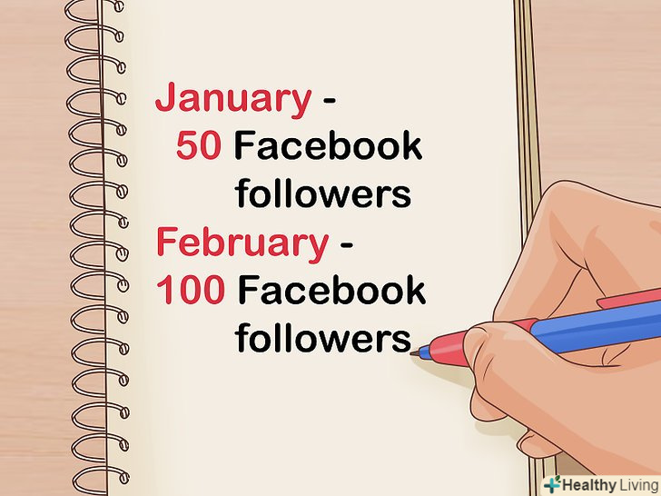 Вирішіть, яким чином ви будете відстежувати свій прогрес.вам буде потрібно визначати ступінь вашого успіху на тижневій або місячній основі.- Наприклад, якщо ви хочете збільшити кількість Ваших друзів на Facebook на 500 осіб, то Вам слід щомісяця вказувати загальне число друзів і число нових друзів, а також кількість відправлених вами повідомлень. На Facebook є зручні інструменти статистичної звітності.