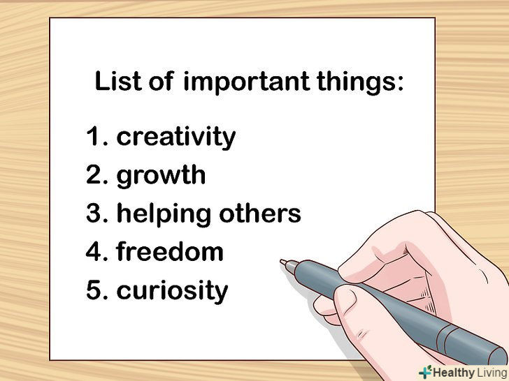 Вирішіть, що для вас важливо.у всіх різні пріоритети. Якщо ви зрозумієте, що важливо саме вам, ви зможете зробити життя більш осмисленим. Складіть список з п'яти важливих речей, а потім подумайте, чи присутні у Вашому житті ці речі. Якщо ні, як ви могли б змінити своє життя, щоб в ній стало більше важливого? [4]- Можливо, вам важлива сім'я або здоров'я. Можна додати в список креативність, зростання, допомога іншим, свободу, цікавість.