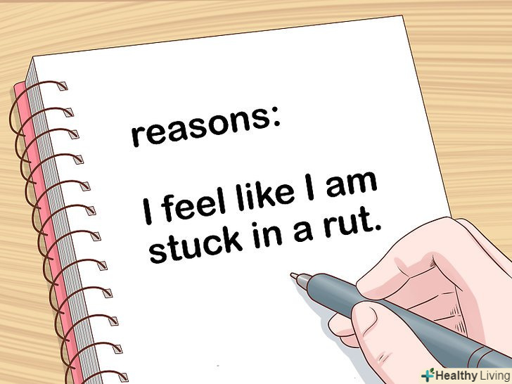 Перерахуйте причини, за якими вам варто наповнити життя сенсом.чому ви вважаєте, що вам це потрібно? Чи відбулося у Вашому житті важлива подія? Може, вам здається, що ви десь застрягли? Якими б не були причини, запишіть їх все. Можна зробити це на папері або на комп'ютері. Це дозволить вам зрозуміти, чому це має для вас значення, і систематизувати свої думки.- Зрозумійте, в чому цінність життя, яка має сенс. Наявність мети покращує якість життя і може навіть продовжити життя.[5]