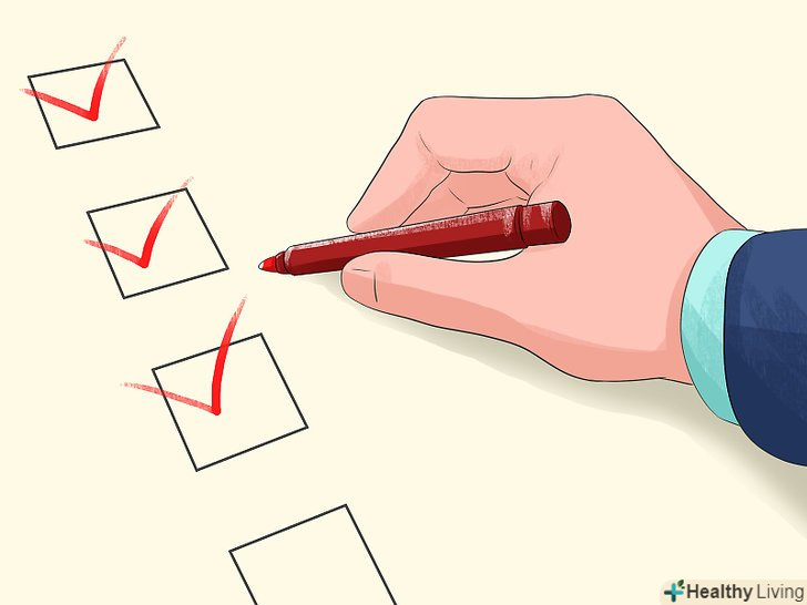 Попросіть друга допомогти вам привчити себе бути відповідальним.друг може допомогти вам досягти поставлених цілей. Знайдіть надійного і неупередженого друга і розкажіть йому про свої цілі. Але спочатку визначитеся, яка саме підтримка вам потрібна в досягненні ваших цілей.[15]- Можливо, ви хочете попросити друга дзвонити вам час від часу і цікавитися вашими успіхами. Або ви віддаєте перевагу запланувати регулярні зустрічі з ним, щоб він зміг перевірити, чи все можливе Ви робите для досягнення вашої мети.