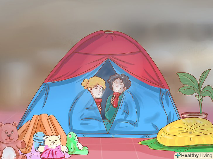 Влаштуйте наметове містечко в приміщенні, якщо на вулиці погана погода.не дозволяйте дощу зруйнувати ваші плани заночувати в наметі-занесіть намет в житло і займайтеся справами, якими ви зазвичай займаєтеся на природі. Встановіть хустку, візьміть спальний мішок і складіть провізію. Якщо ви зібралися разом з друзями, тоді можна розповідати історії про привидів або грати в карти.[2]- Можна навіть запекти зефір на плиті або в мікрохвильовій печі, якщо батьки вам дозволили!