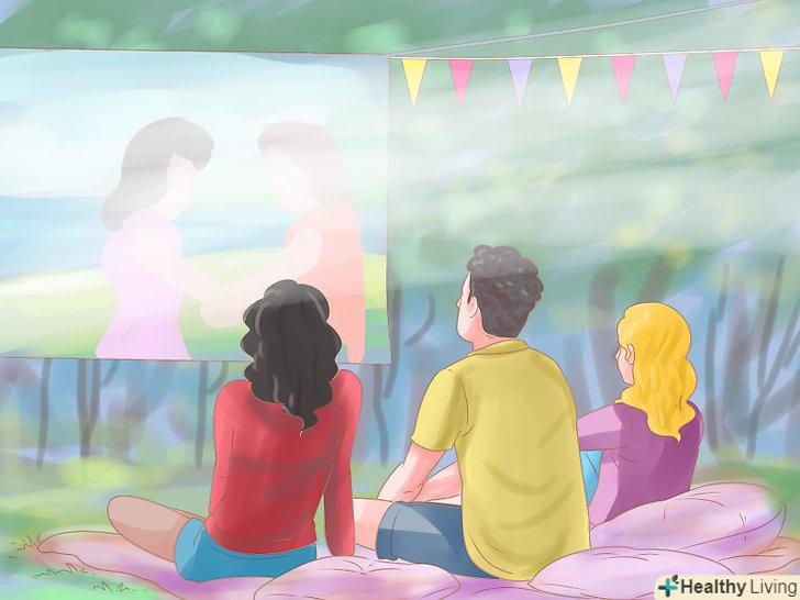 Влаштуйте відкритий кінотеатр з їжею і напоями.вам буде потрібно проектор, колонки і місце для екрану достатнього розміру, на яке можна проектувати зображення. Також візьміть Ковдри, подушки та стільці. Приготуйте попкорн та інші закуски і напої.[8]- Також можна проектувати зображення на двері гаража або однотонну стіну.