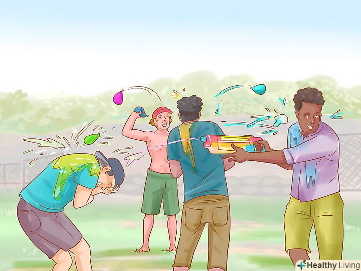 Охолодіть наВодній битві з водними пістолетами або іншими ємностями. можна грати без правил, щоб люди не вибували з гри навіть після декількох влучень, або визначити відповідні основні правила. Намагайтеся не цілитися в обличчя і домовтеся не вибігати з двору на вулицю.[9]- Не забувайте використовувати сонцезахисний крем, щоб не "згоріти" на сонці.