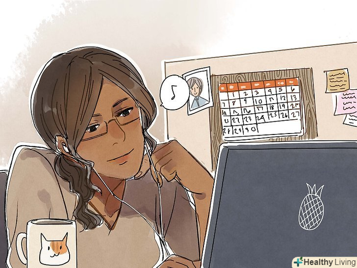 Максимально обживіть своє робоче місце.Один із способів впоратися з тривогами під час роботи — створити найбільш зручну для вас робочу атмосферу. Це однозначно допоможе менше концентруватися на своїх переживаннях і відчувати себе на роботі як вдома. Чим щасливіше ви від того, що вас оточує, тим менше ймовірність занепокоєння.- Принесіть фотографії друзів або сім'ї, свою улюблену чашку, іграшку або улюблену дрібничку. Можете також наклеїти надихаючі цитати або жарти, щоб бути в тонусі протягом дня.[6]