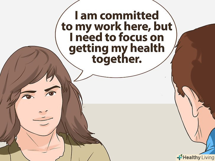 - Поговоріть зі своїм начальником або викладачем про мінімальні і конкретні завдання, які вам необхідно виконати, щоб залишатися в курсі останніх подій. Сплануйте провести особисту зустріч, щоб порозумітися. Спробуйте сказати: "я відданий своїй роботі тут, але мені потрібно зосередитися на своєму здоров'ї. Що саме мені потрібно зробити в найближчі кілька місяців, щоб не відставати?»