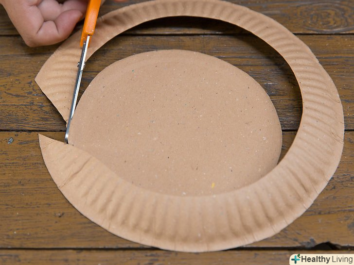 Відріжте піднятий бортик паперової тарілки.зрізайте тільки край без центральної частини, щоб змійка була не дуже маленькою.- Якщо в вас по рукою немає паперової тарілки, можна взяти звичайну тарілку невеликого діаметру і обвести по контуру на великому аркуші паперу. Візьміть ножиці і виріжте вийшов коло.