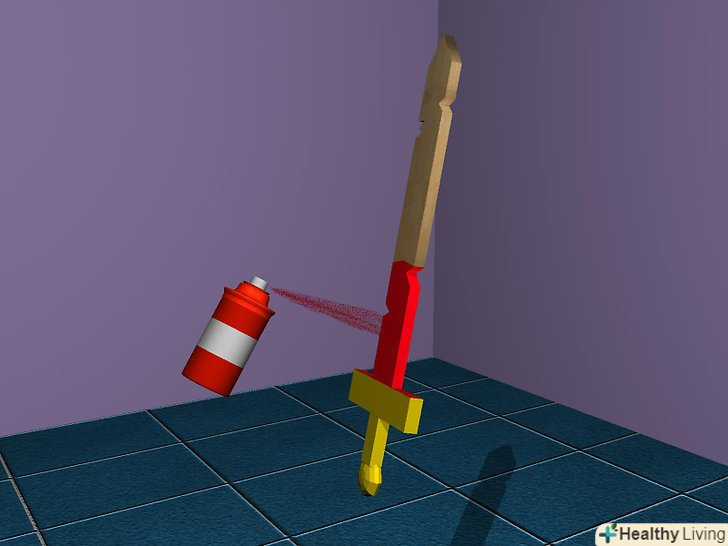 Поліруйте і заґрунтуйте.як тільки ручка зі шкантів буде приклеєна, відітріть наждачним папером клей, який вилазить зі сторін, і візьміть меч в руку. Якщо рукоять не зовсім зручна, відполіруйте трохи краю, однаковим чином з обох сторін, поки рукоять не стане довгастої, і її буде зручніше тримати в руці. Коли ви будете задоволені результатом, обмотайте рукоять будівельної стрічкою і нанесіть шар грунту, на одну сторону леза, а потім і на іншу. Нанесіть другий шар, щоб повністю прикрити позначки лінійки. Дайте обом шарам добре висохнути.