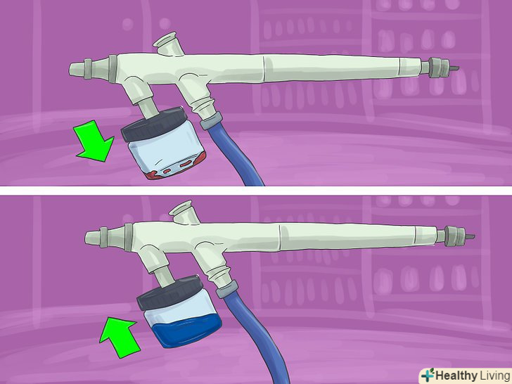 - При ємності середнього розміру аерограф з нижньою подачею потрібно помістити в сторону або вниз від джерела подачі. Повітряна кисть буде подавати фарбу прямо з цієї ємності в процесі роботи.