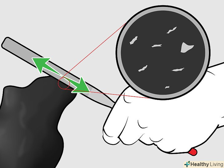 Пошліфуйте камінь напилком і пошукайте на місці шліфування блискучі металеві лусочки.більшість метеоритів містять блискучий на вигляд метал під корою плавлення. Відшліфуйте куточок каменю алмазним напилком і перевірте, чи є всередині метал.[20]- Щоб сточити поверхню метеорита, вам знадобиться алмазний напилок. Процес шліфування зажадає деякого часу і значних зусиль. Якщо ви не можете зробити це самі, можете віднести камінь в лабораторію фахівця.[21]