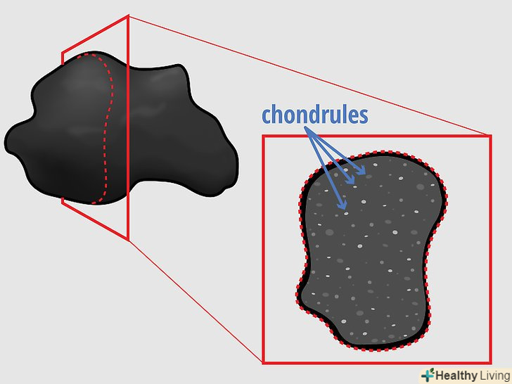 Перевірте, чи є всередині каменю маленькі кульки кам'яного матеріалу.більшість метеоритів, що падають на Землю, відносяться до типу хондритів. Такі Метеорити містять всередині маленькі кам'яні гранули, які називаються хондрами. Вони виглядають як маленькі камінчики різного розміру, форми і кольору.[22]- Хоча хондри зазвичай знаходяться всередині метеорита, вивітрювання може зробити їх видимими і на його поверхні, якщо той достатній час перебував під впливом земних стихій.