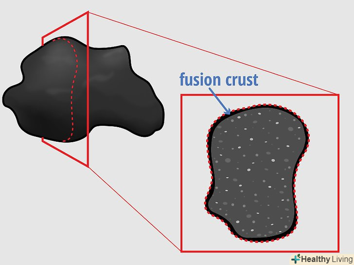 Визначте, чи має камінь кору плавлення.коли метеорит проходить через земну атмосферу, його поверхня починає плавитися, а тиск повітря відкидає розплавлений матеріал назад. В результаті утворюється абсолютно рівна оплавлена поверхня, звана корою плавлення. Якщо знайдений вами камінь виглядає оплавленим і зміненим, він може бути метеоритом.[4]- Кора плавлення зазвичай буває гладкою і абсолютно рівною, хоча на ній можуть також бути сліди брижі і «крапельки», що утворилися там, де розплавлена порода перемістилася і знову затверділа.