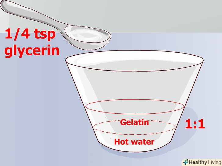 Підготуйте желатин.найпростіший рецепт-це 1 частина желатину до однієї частини гарячої води. Інгредієнти потрібно перемішати в ємності. Однак при таких пропорціях желатин може висихати і стискатися, через що шрам може розвалитися.[5] багато гримери рекомендують додавати в суміш трохи гліцерину, щоб шрам не висихав занадто швидко.- Додайте чверть чайної ложки гліцерину до суміші желатину з водою в пропорції 1: 1.[6]