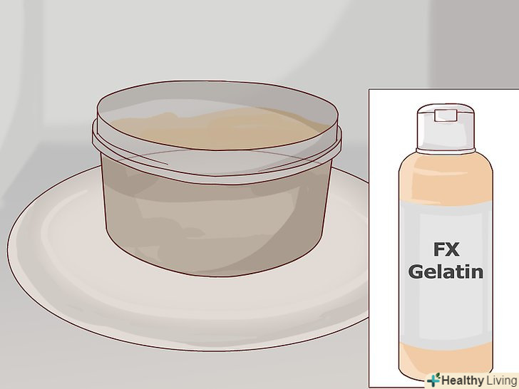 Розігрійте воду, якщо плануєте використовувати готовий желатин для гриму.налийте в ємність воду, щоб та розігріла желатин до потрібної температури. Зазвичай готовий желатин продається в пляшках. Щоб він став рідким, його потрібно нагріти. Коли желатин розтопиться і трохи охолоне (Гарячий желатин може обпалити шкіру), нанесіть його на шкіру.- Перевіряйте температуру і консистенцію желатину на невеликій ділянці шкіри (наприклад, на долоні або передпліччя), перш ніж нанести велику кількість суміші на велику площу.