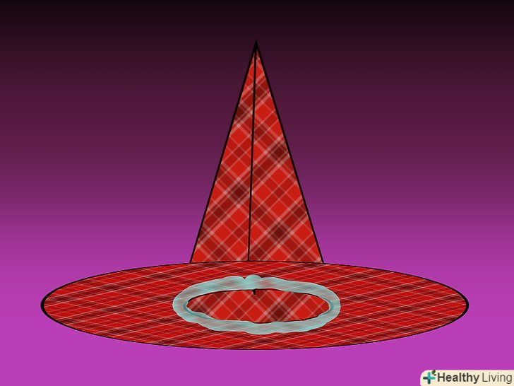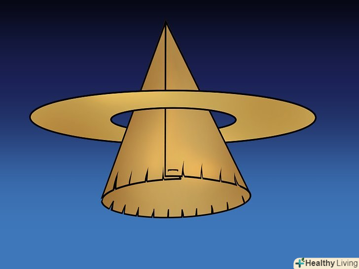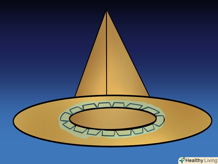 - Приєднайте поля до капелюха. надіньте кільце на верхівку конуса і простягніть до порізаного підстави. Приклейте і скріпіть скотчем бахрому до полів з внутрішньої сторони.