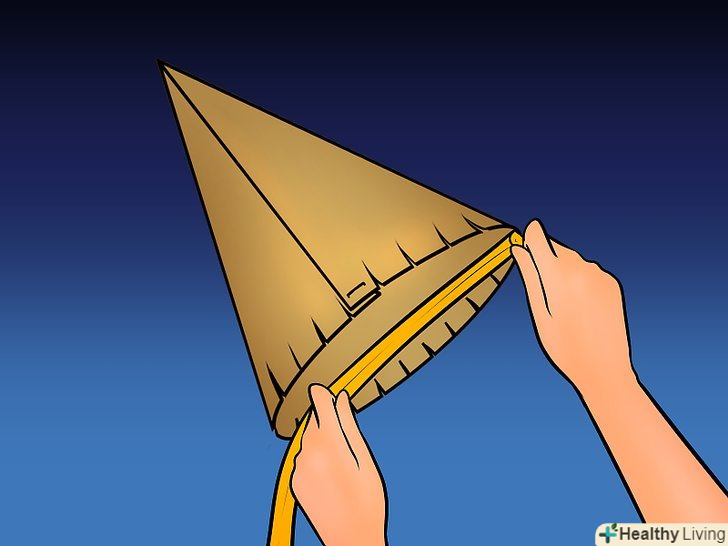 Згорніть матеріал в конус. скачуйте підкладку так, щоб зверху утворилася вершина. Тримайте нижню частину на робочій поверхні.- Як тільки окружність капелюха буде дорівнює окружності голови власника, скріпіть конус і приміряйте його. Якщо він добре сидить, можете продовжувати. Якщо це не так, зробіть окружність більше або менше, в міру необхідності.