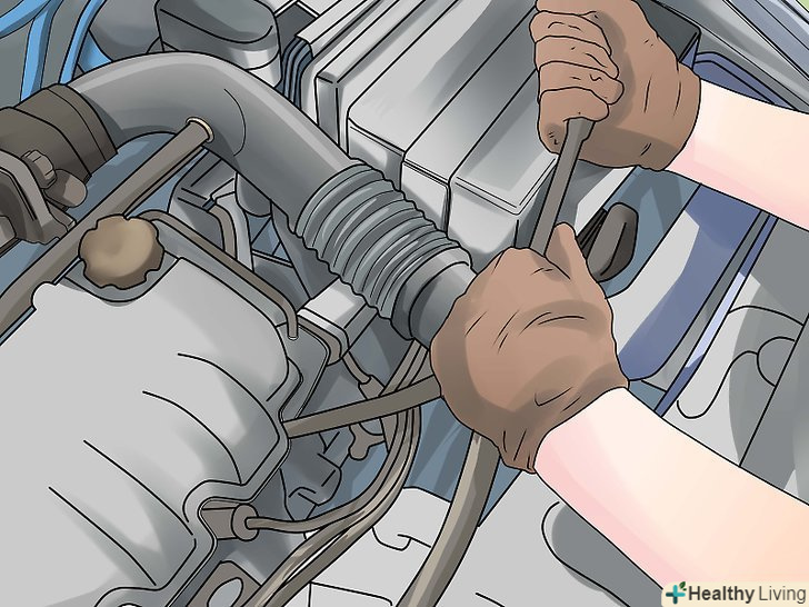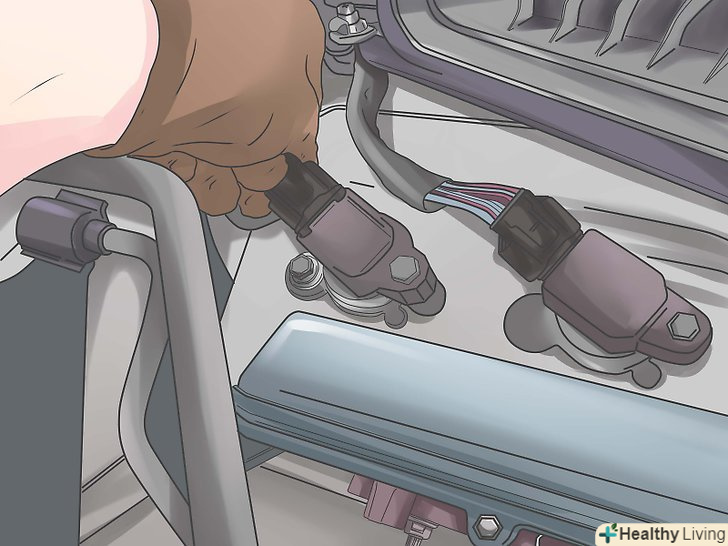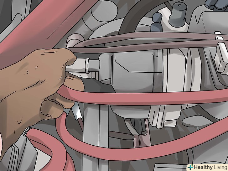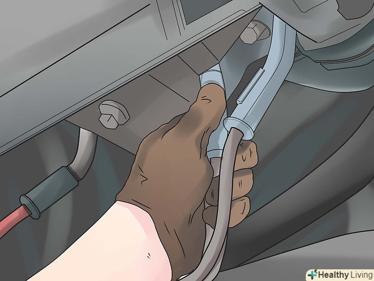 Від'єднайте один високовольтний провід від свічки.зазвичай кожній свічці відповідає окремий кабель. Щоб уникнути травм, завжди користуйтеся захисними засобами та інструментами з ізольованими ручками при роботі з електричною системою вашого авто.- Якщо ви недавно заглушили автомобіль, його двигун напевно буде дуже гарячим. У автомобіля, що був в дорозі всього 15 хвилин, температура двигуна становить близько 90 °С. Дайте йому охолонути протягом години, щоб уникнути серйозних травм.