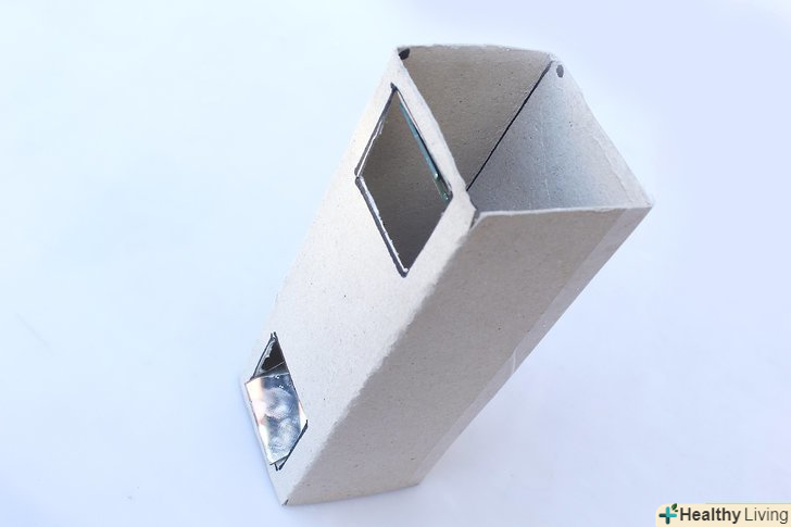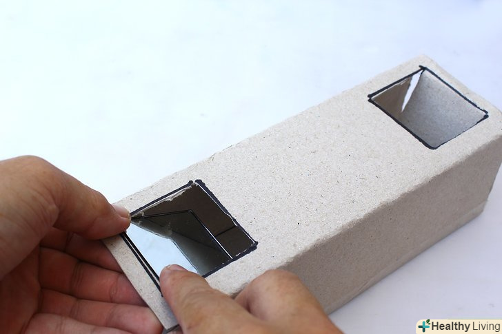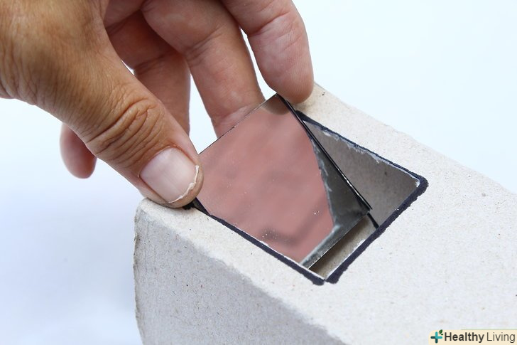 Вставте дзеркало в виріз лицьовою стороною до себе під кутом 45 градусів. використовуйте клейові подушечки або двосторонній скотч, щоб закріпити дзеркало на внутрішній поверхні стінок. Розташуйте дзеркало так, щоб через виріз було видно всю його поверхню, і воно нахилялося в вашу сторону під кутом 45 градусів.- Якщо немає транспортира, вивірити кут 45 градусів можна лінійкою. Дзеркало і стінки коробки повинні являти собою рівнобедрений прямокутний трикутник, де дзеркало буде гіпотенузою.