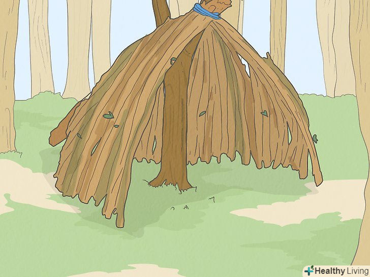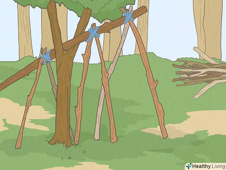 - Якщо у вас є мотузка або мотузка, можна скласти з гілок конструкцію на зразок намету, проклавши одну гілку горизонтально для формування даху, після чого зв'язати гілки між собою. Для подібної роботи можуть знадобитися відразу кілька людей.