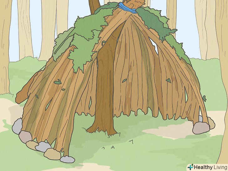 - Якщо у вас є брезент, розтягніть його між деревами, прив'язавши за кути, щоб спорудити непромокальний дах. А щоб такий дах не провисала від дощу, підкладіть знизу в центр брезенту невеликий камінчик. Обв'яжіть його довгою мотузкою з верхньої сторони брезенту і закріпіть цю мотузку на високо розташованій гілці. [5]