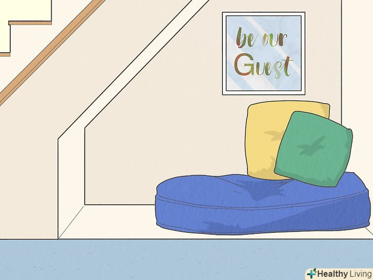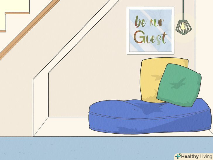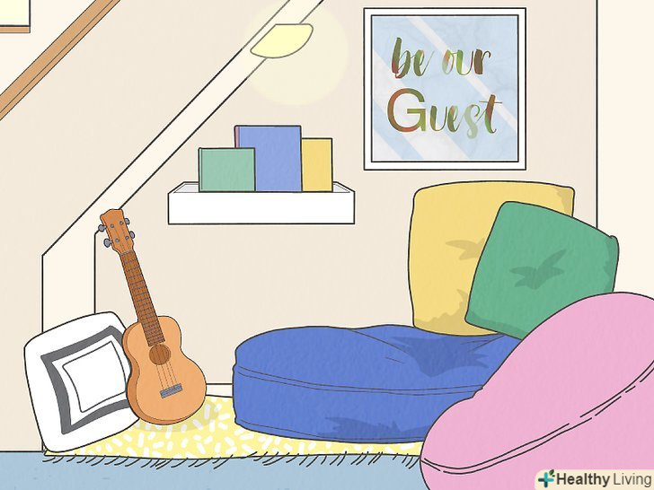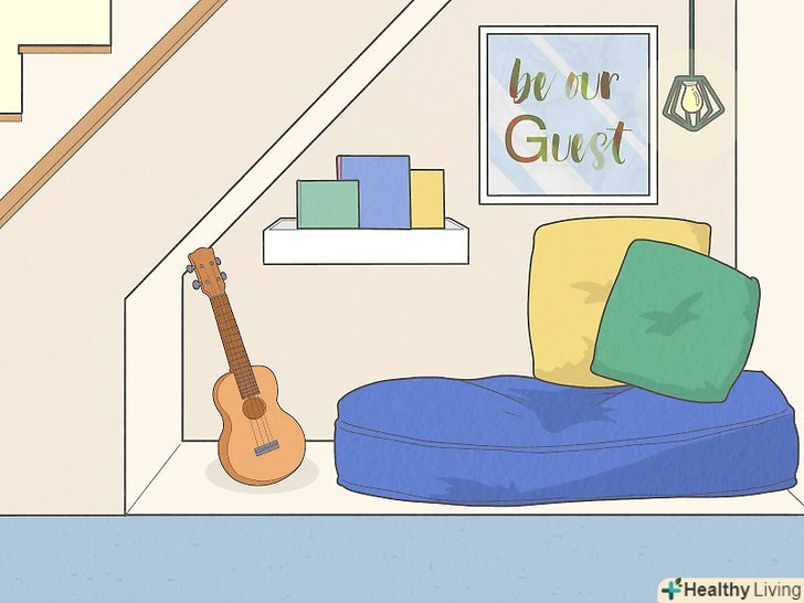 Звільніть для дитячої зони відпочинку зручне місце. Як тільки дитяча зона відпочинку буде облаштована, вона може стати найулюбленішим місцем дітей на довгі дні і тижні вперед. Найкраще влаштовувати таку зону безпосередньо в дитячій спальні або ігровій кімнаті, але також для цього підійде і один з куточків залу або інший вільної кімнати. Приберіть звідти всі цінні і тендітні предмети, щоб захистити їх від бешкетних непосид.- У деяких приватних будинках можуть бути присутніми непримітні затишні місця відповідного розміру для дітей, наприклад, відмінною дитячою зоною може стати простір під сходами.
