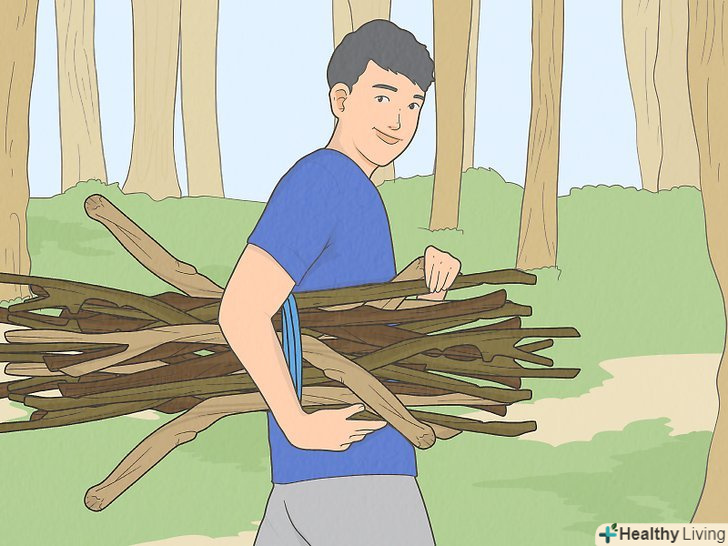 Зберіть необхідні матеріали для побудови куреня. пошукайте опале великі гілки, які виглядають досить міцними, але не настільки важкі, щоб впавши, вони могли кого-небудь травмувати. Якщо в окрузі не так багато великих гілок, спробуйте зв'язати між собою більш дрібні гілки або просто принесіть з дому бамбукові стовпчики для підв'язки рослин, живці для мітли, стільці або інші підручні матеріали. [4]- Ніколи не ламайте живі гілки. Ставтеся до лісу з повагою і не завдавайте шкоди навколишньому середовищу.