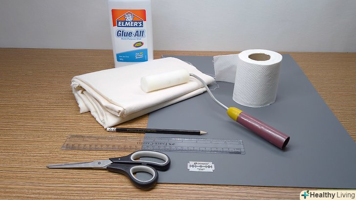 Підготуйте необхідні матеріали. слід придбати пінокартон, лист ДВП, твердий картон або березову фанеру. Пінокартон можна купити в місцевому магазині товарів для творчості, а три останніх матеріалу продаються в будь-якому будівельному магазині. Потрібна панель товщиною близько 12 міліметрів. Розміри залежать від бажаного розміру картини. Якщо у продажу є тільки розкроєні листи, то вибирайте плиту такого розміру, який буде більше готового полотна. Також потрібні:- Лляна або бавовняна тканина. Зазвичай тканина продається в рулонах. Загляньте в магазин товарів для творчості та рукоділля. Стандартний розмір тканини становить 53 x 127 сантиметрів. З неї можна зробити два полотна розміром 50 x 60 сантиметрів. [7]